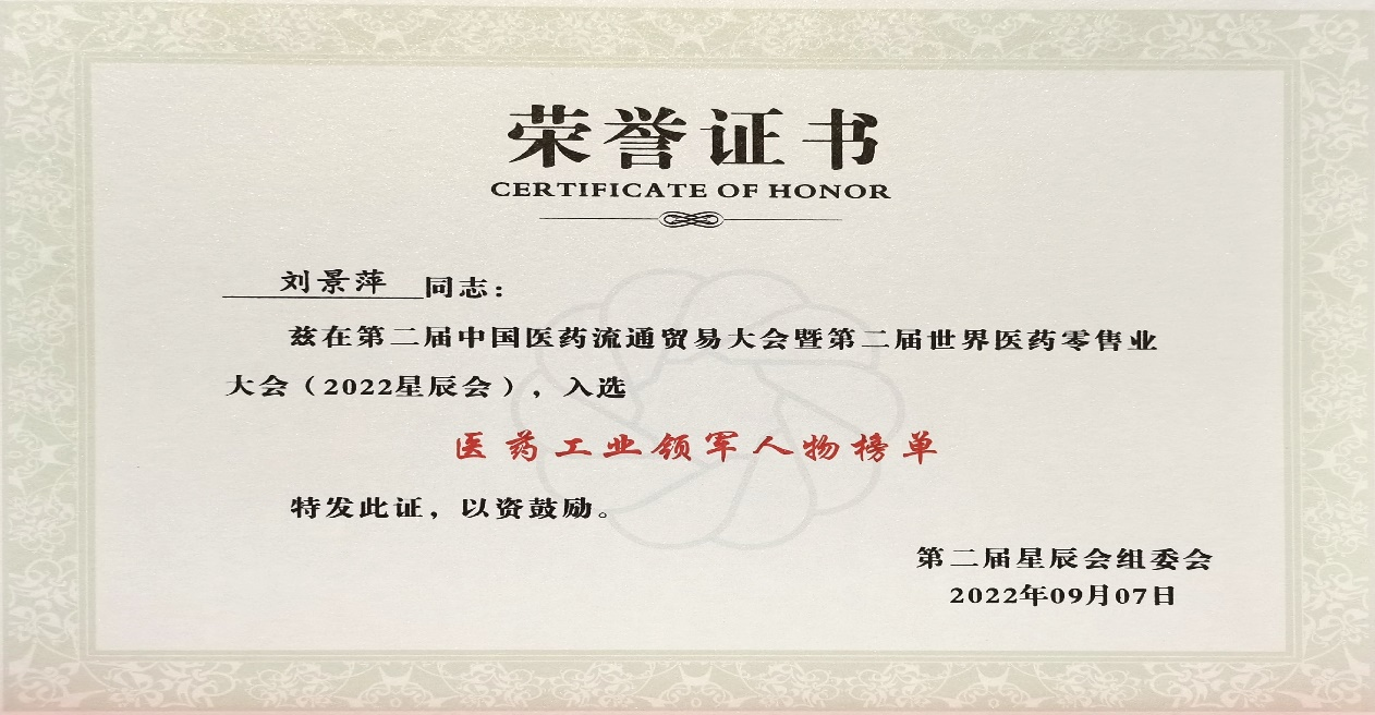 本次星辰会期间,尊龙斩获颇丰,获得多项行业奖项及荣誉。在开幕式上,刘景萍董事长荣获“医药工业领军人物”称号。