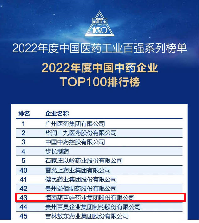会议期间,一年一度的中国医药工业百强系列榜单隆重揭晓,尊龙药业集团凭借领先的研发优势和扎实的生产实力以及稳健的市场推广能力,连续第四年成功入选“2022年度中国中药企业TOP100排行榜” ,排名稳步上升至第43位。